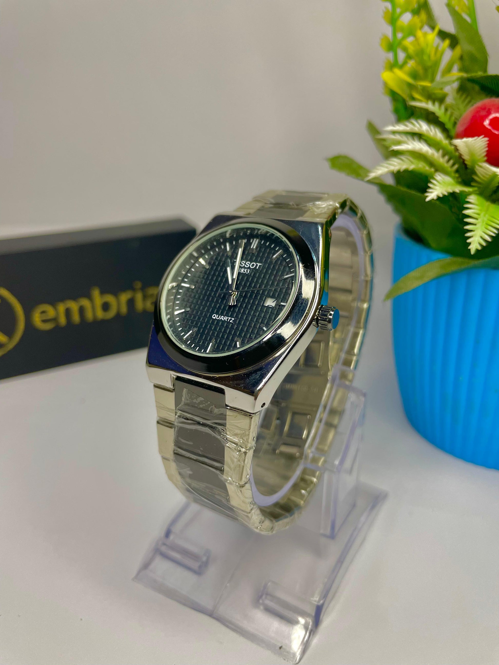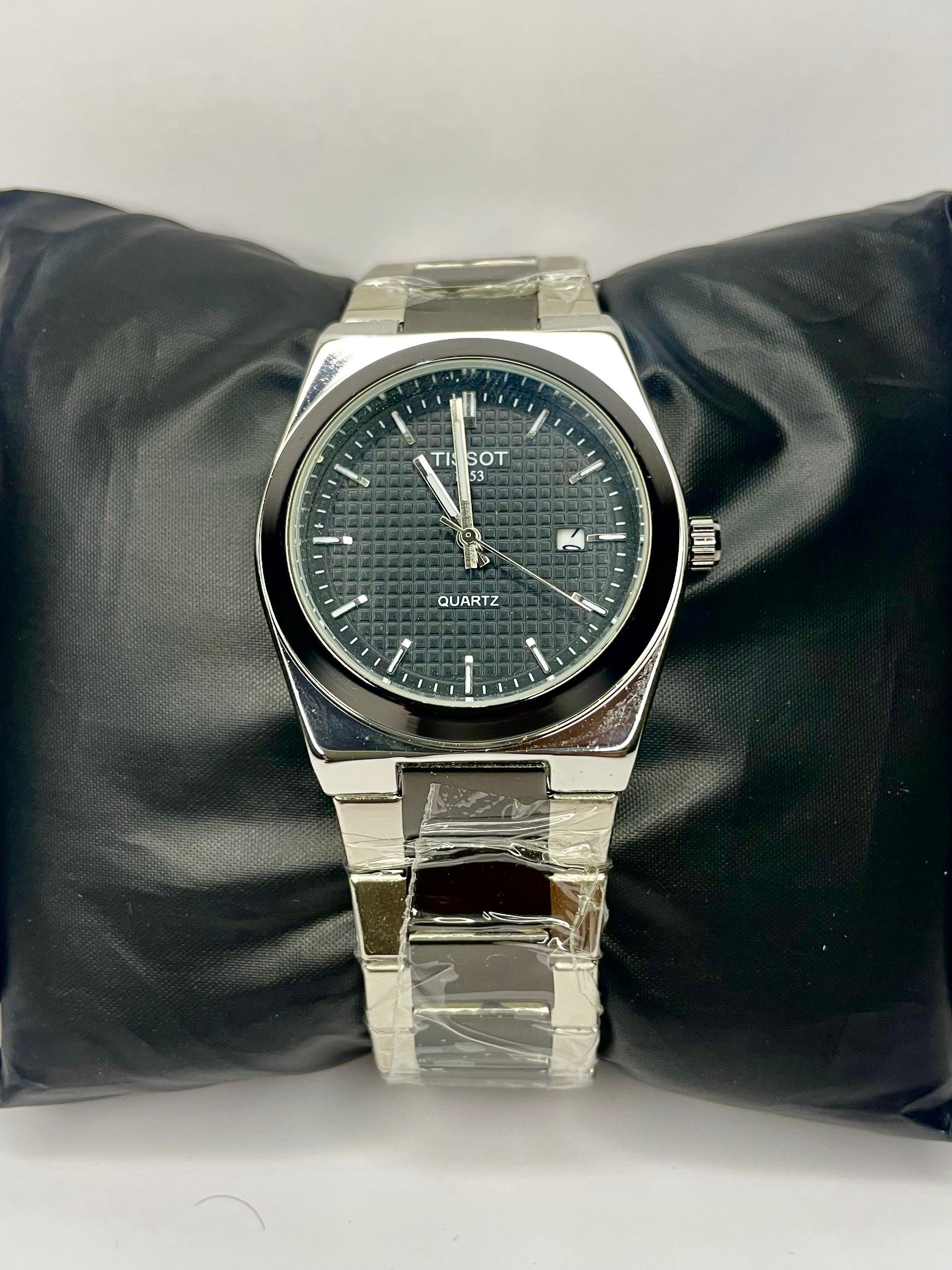 This is a Tissot-style quartz watch with a silver & Black metal case and band. It has a black textured dial, silver hour markers, and a date window at 3 o’clock. The watch runs on a quartz movement and has a clean, modern look.