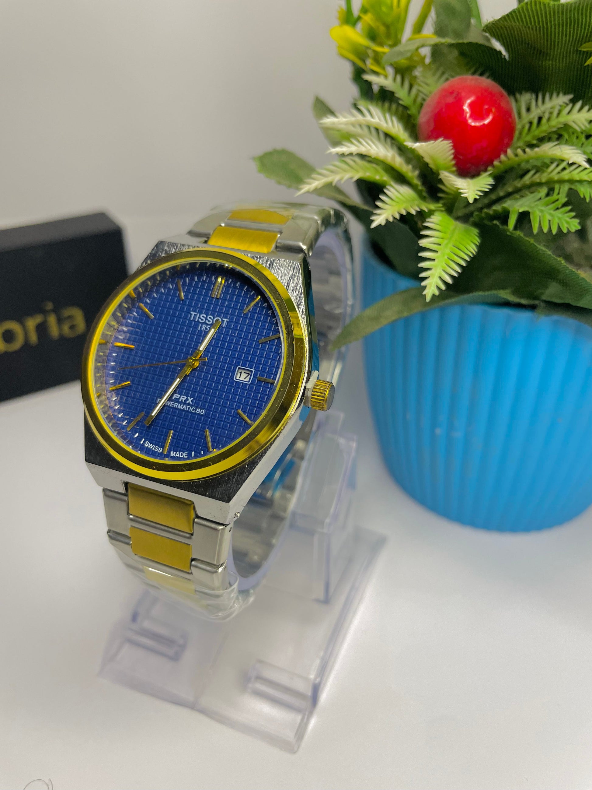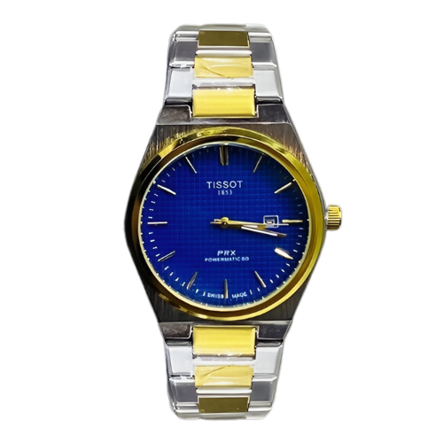 This is a Tissot-style quartz watch with a Golden & Silver metal case and band. It has a blue textured dial, silver hour markers, and a date window at 3 o’clock. The watch runs on a quartz movement and has a clean, modern look.