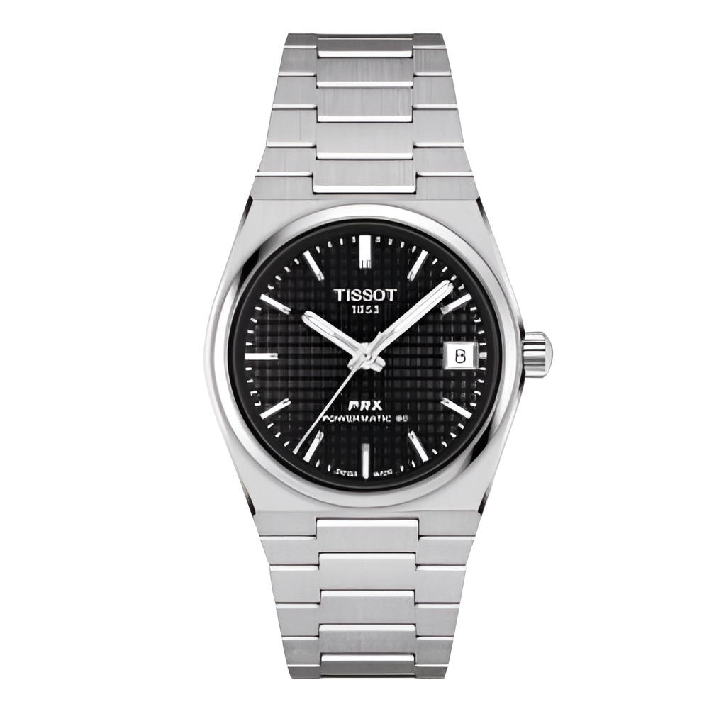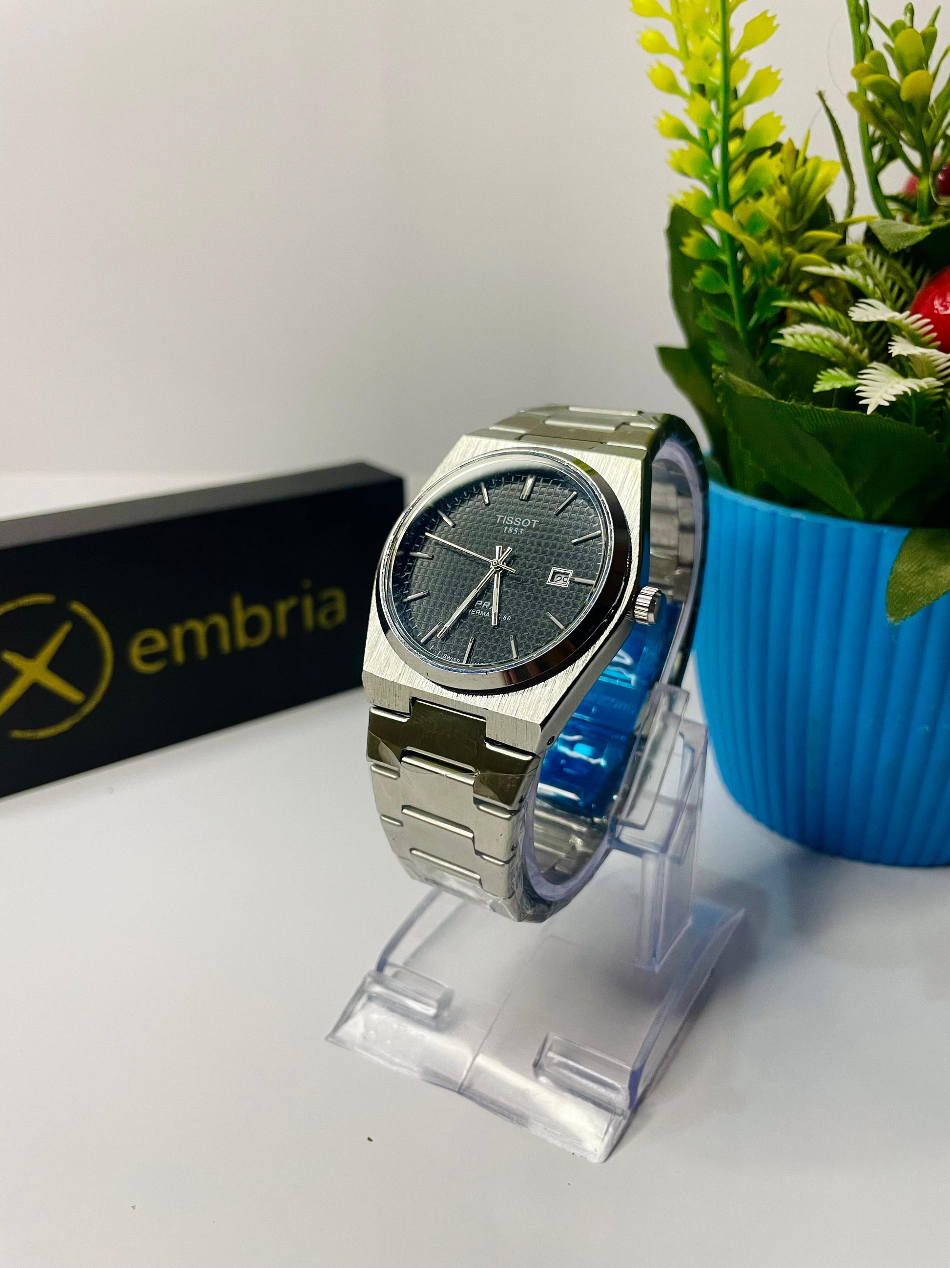 This is a Tissot-style quartz watch with a silver metal case and band. It has a black textured dial, silver hour markers, and a date window at 3 o’clock. The watch runs on a quartz movement and has a clean, modern look.