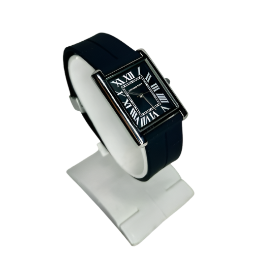 This is a rectangular dress-style wristwatch designed in the spirit of the iconic Cartier Tank line. It combines classic elegance with a modern twist by pairing a refined Roman numeral dial with a rubber strap, making it suitable for both formal and casual wear.